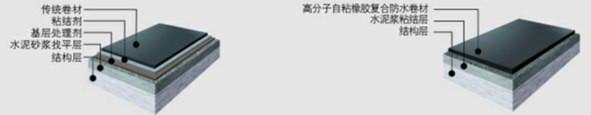 普通的自粘卷材勉強能與混凝土基面實現(xiàn)牢固粘結(jié),但其抗穿刺、延伸率等物理性能相對較弱;普通的高分子卷材具有良好的物理性能,但其大多數(shù)與基面不易粘結(jié),采用空鋪或機械固定施工,常用于外露式屋面,在隱蔽工程中,易發(fā)生“竄水”現(xiàn)象。